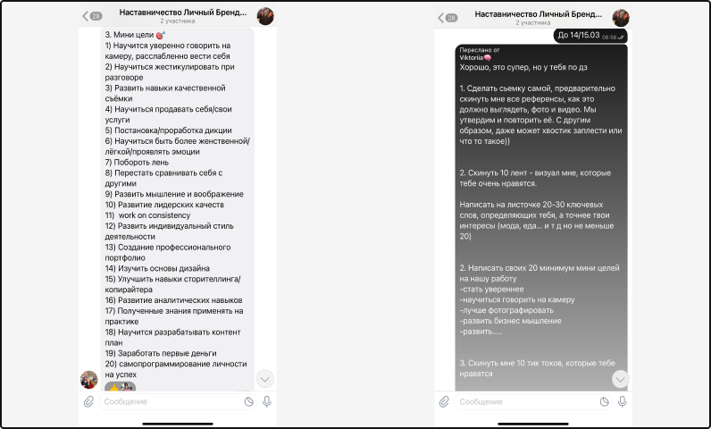 - Мы ставим цели на наставничество (примерно 10-15 целей) и под моим руководством — мы все их достигаем. К примеру: научиться работать дисциплинированно, стать независимой, научиться красиво разговаривать, улучшить дикцию и т д!